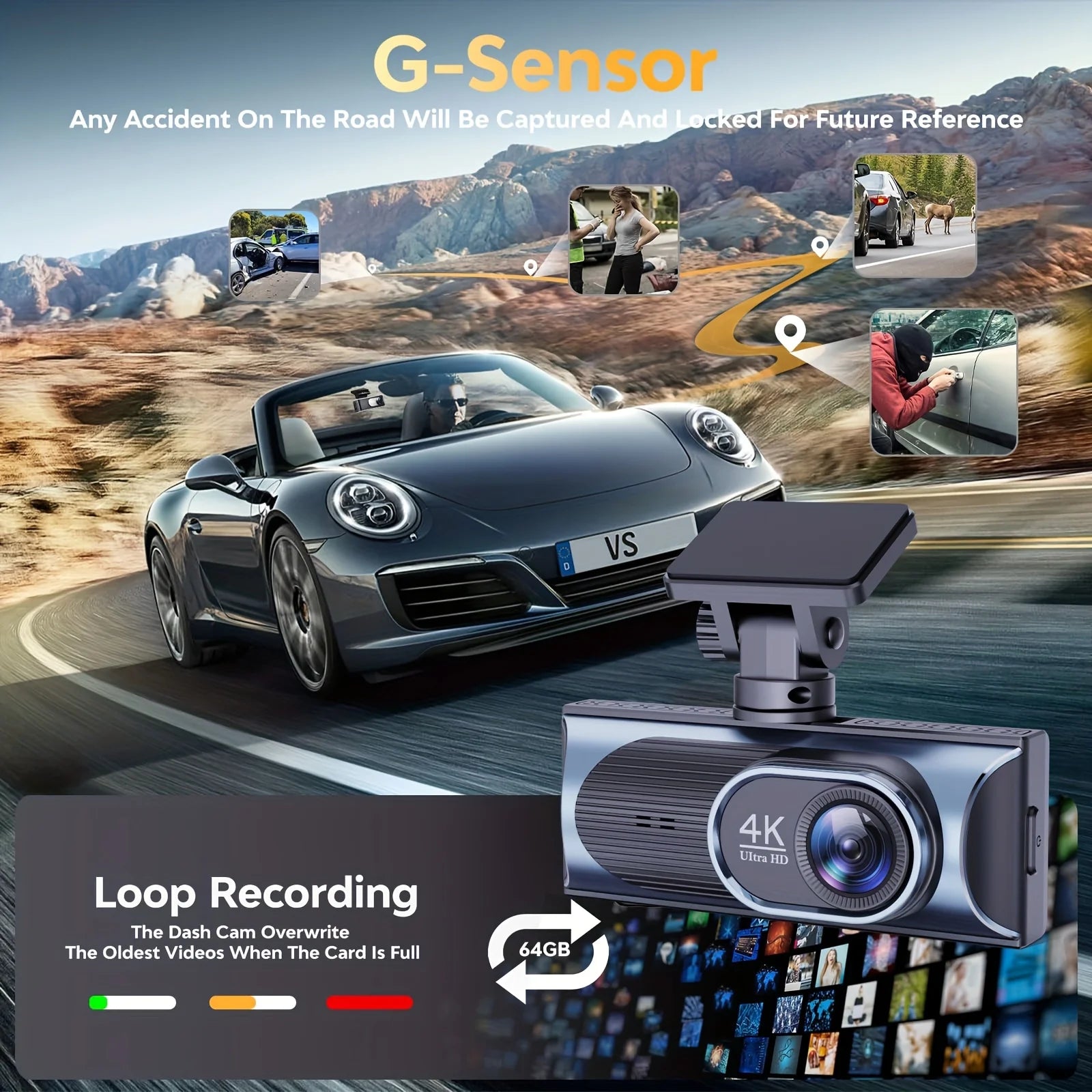 - Loop Recording & G-Sensor – Automatic recording with collision detection and file protection